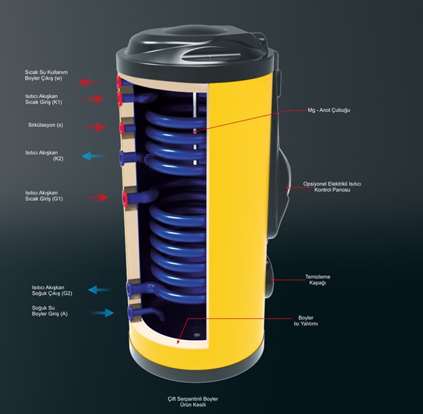 | Avrupa standartlanna göre (EN 12897) üretmiş olduğumuz emaye kaplı Çift Serpantinli Hızlı Boylerler villalarda, otellerde, binalarda,restaurantlarda, fabrikalarda, ve sıcak su ihtiyacı duyulan diğer mekanlarda sıcak su veya buhar kazanına ya da güneş kolektörüne bağlanılarak kullanılır. |